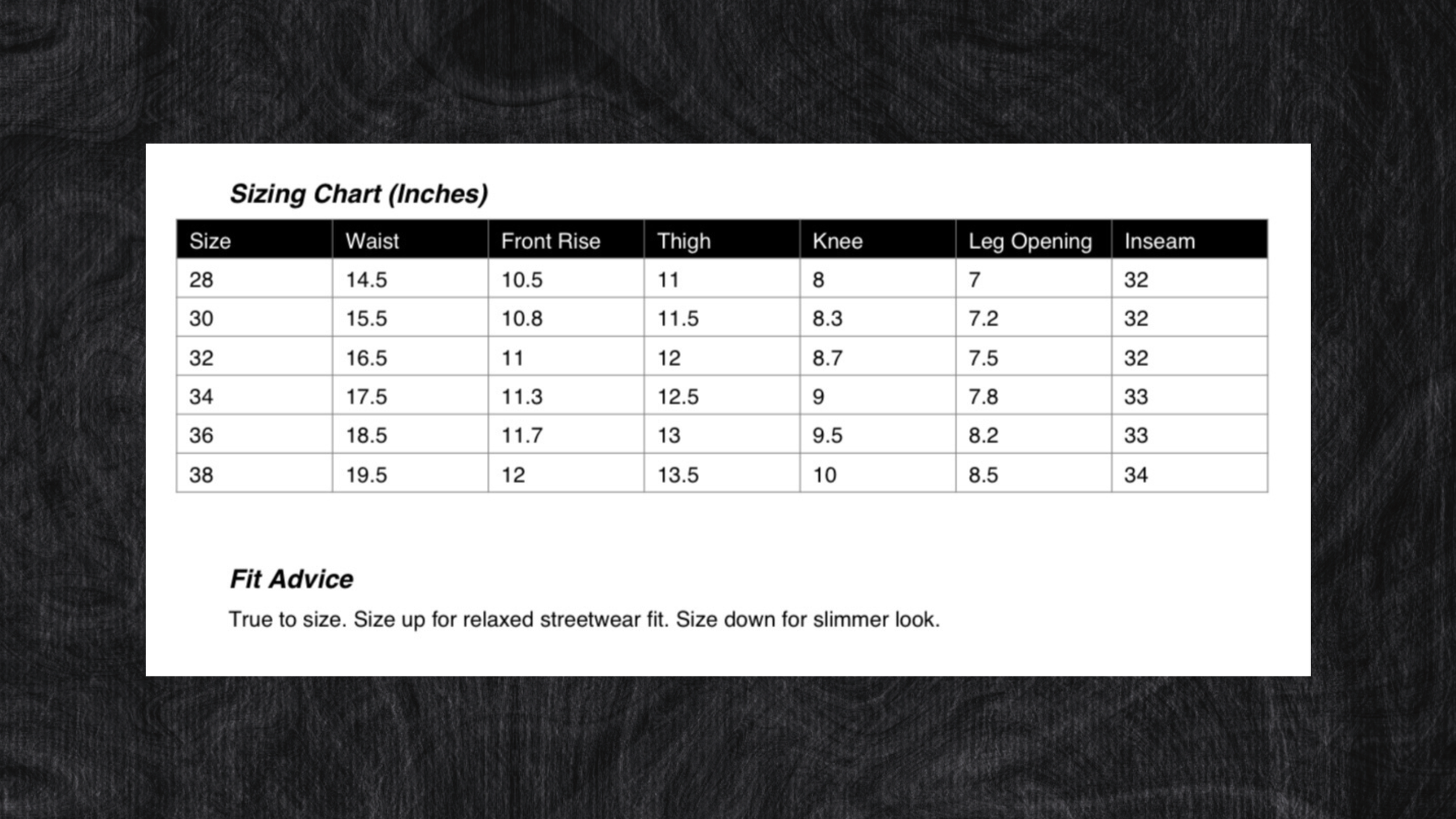 • True to size. Size up for relaxed streetwear fit. Size down for slimmer look.